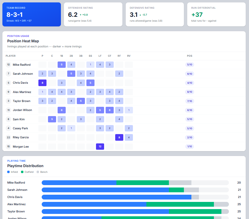 The reporting foundation is quickly moving along. Position heat maps, rotation summaries, fairness scoring — the structure is in place and we're tightening the logic now. You can already see where it's headed inside the app.