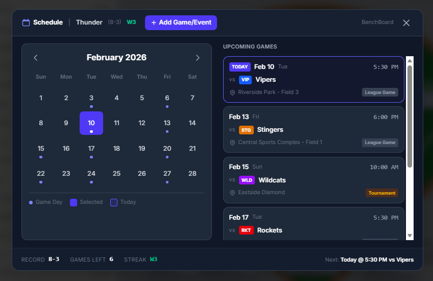 So we went back and rebuilt the responsive layout from the ground up. BenchBoard now adapts across desktops, laptops, tablets, and mobile browsers — not as an afterthought, but as a priority. Whether you're on a 27-inch monitor at home or a tablet propped up in the dugout, the experience holds up.